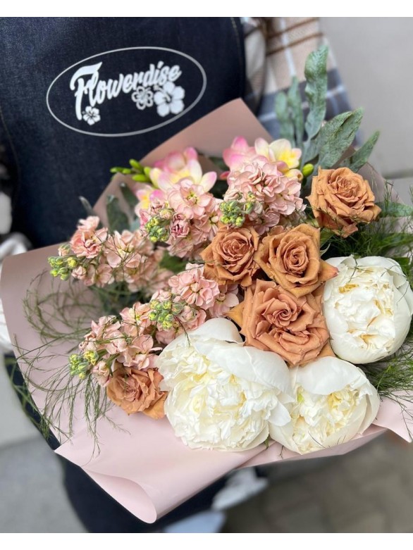Kwiaty bazowe: peonie, róże, lewkonie i dodatki.