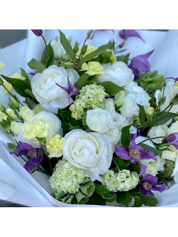 Biały kolor kwiatów symbolizuje niewinność, czystość i radość, podczas gdy fioletowe akcenty dodają mu nuty delikatności i romantyzmu. Ten bukiet jest doskonałym wyborem na specjalną okazję, taką jak ślub, zaręczyny lub urodziny, i z pewnością zrobi wrażenie na osobie, która go otrzyma.